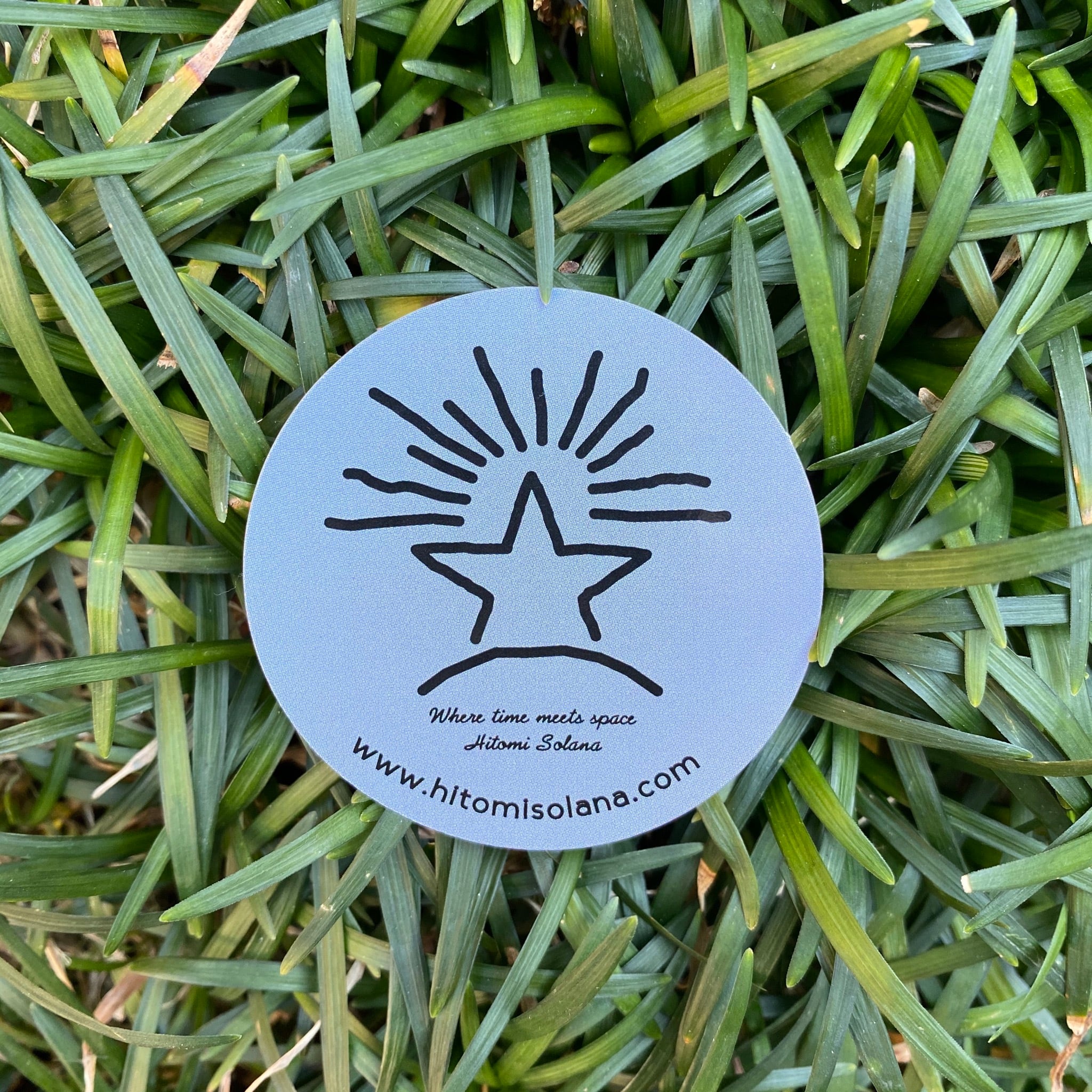 ワンスターイラストとメッセージ<Where time meets space>が描かれたステッカー。